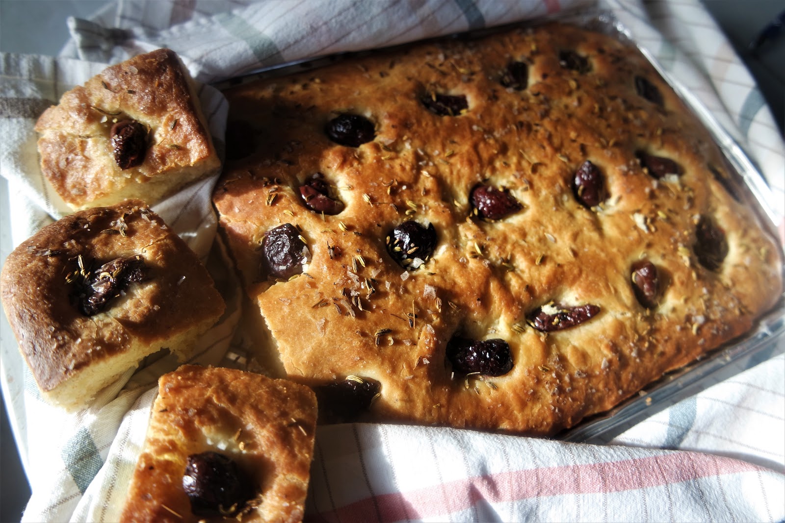 Mitä jos yllättäisit yksinäisen naapurin, sukulaisen tai oman rakkaasi ihanalla italialaisella focaccialla? Löysin vihdoin toimivan reseptin, jolla leipuri pääsee helpolla ja lisäksi leivän koostumus ja maku ovat spot on. Nauti palaset sellaisinaan tai dippaa ne oliivi-balsamico seokseen kuten italialaiset tekevät. Minun oli pakko kiikuttaa osan leivästä pakastimeen, muuten olisimme syöneet kaiken kertaheitolla. Focaccia maistuu parhaalta leivontapäivänä. Alkuperäinen resepti löytyi ruotsalaisesta Tasteline-sivustosta, mutta koristelin focaccian eri tavalla.